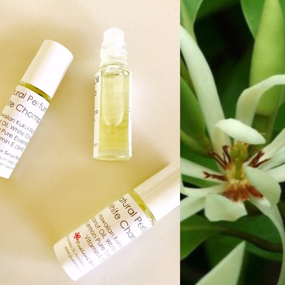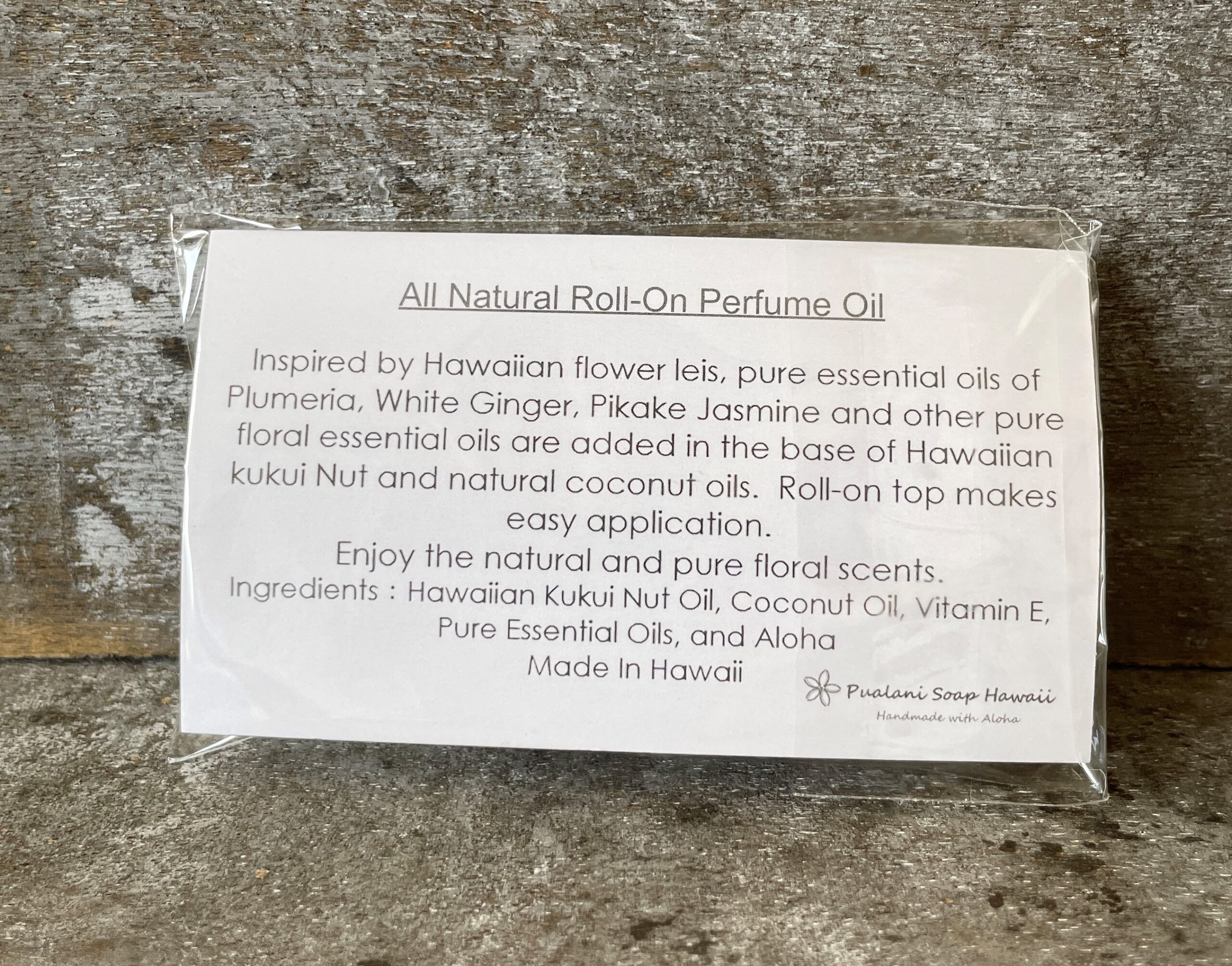 Hawaiian Kukui oil, coconut oil, vitamin E, pure essential oils, and Aloha