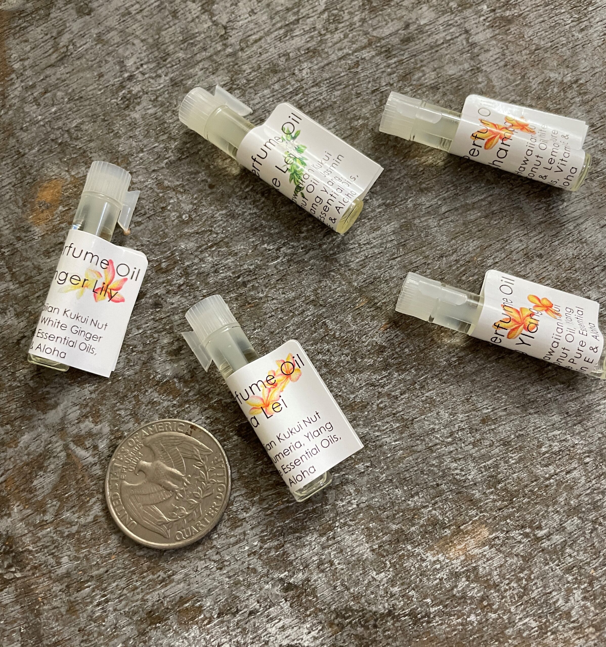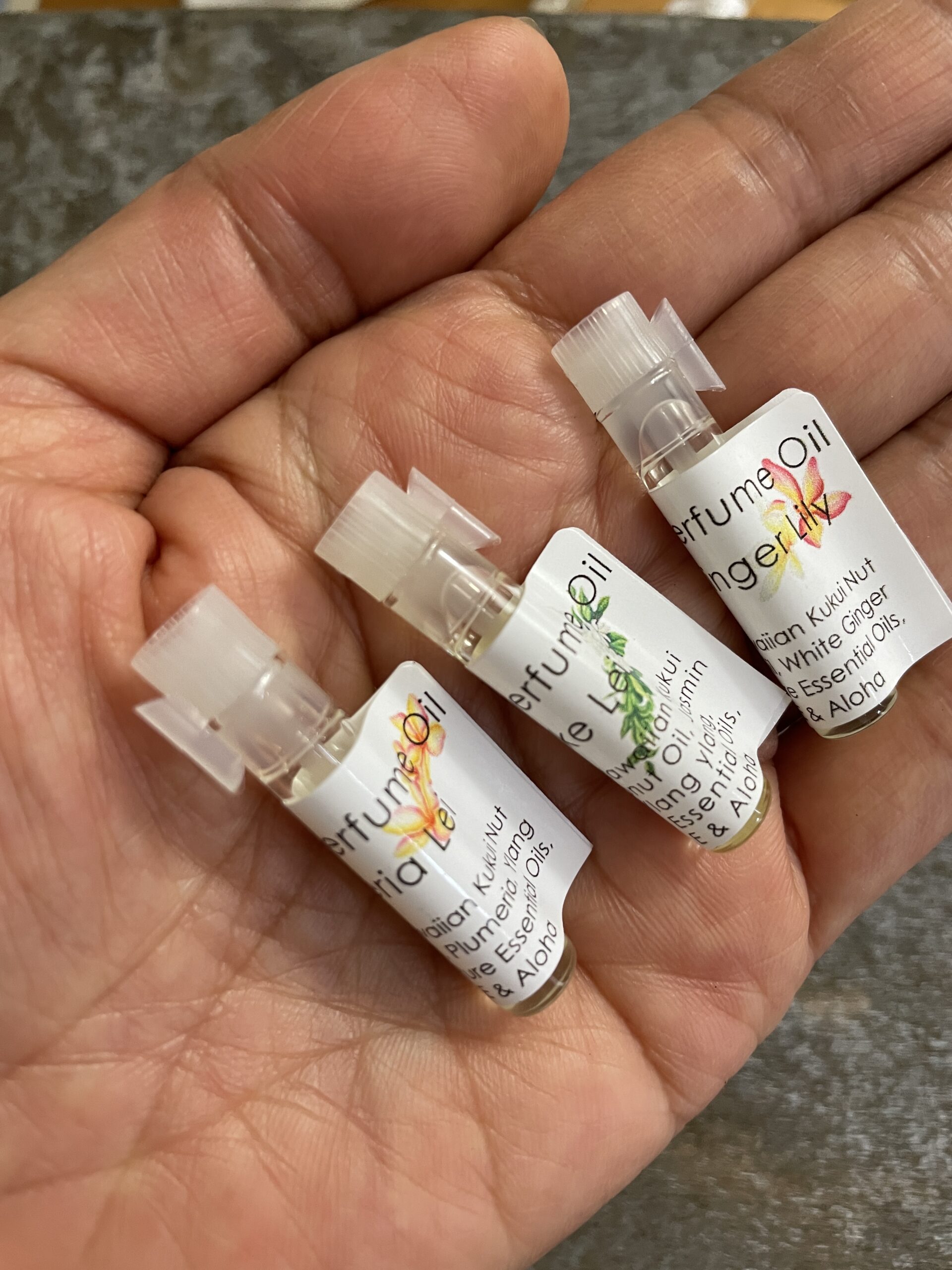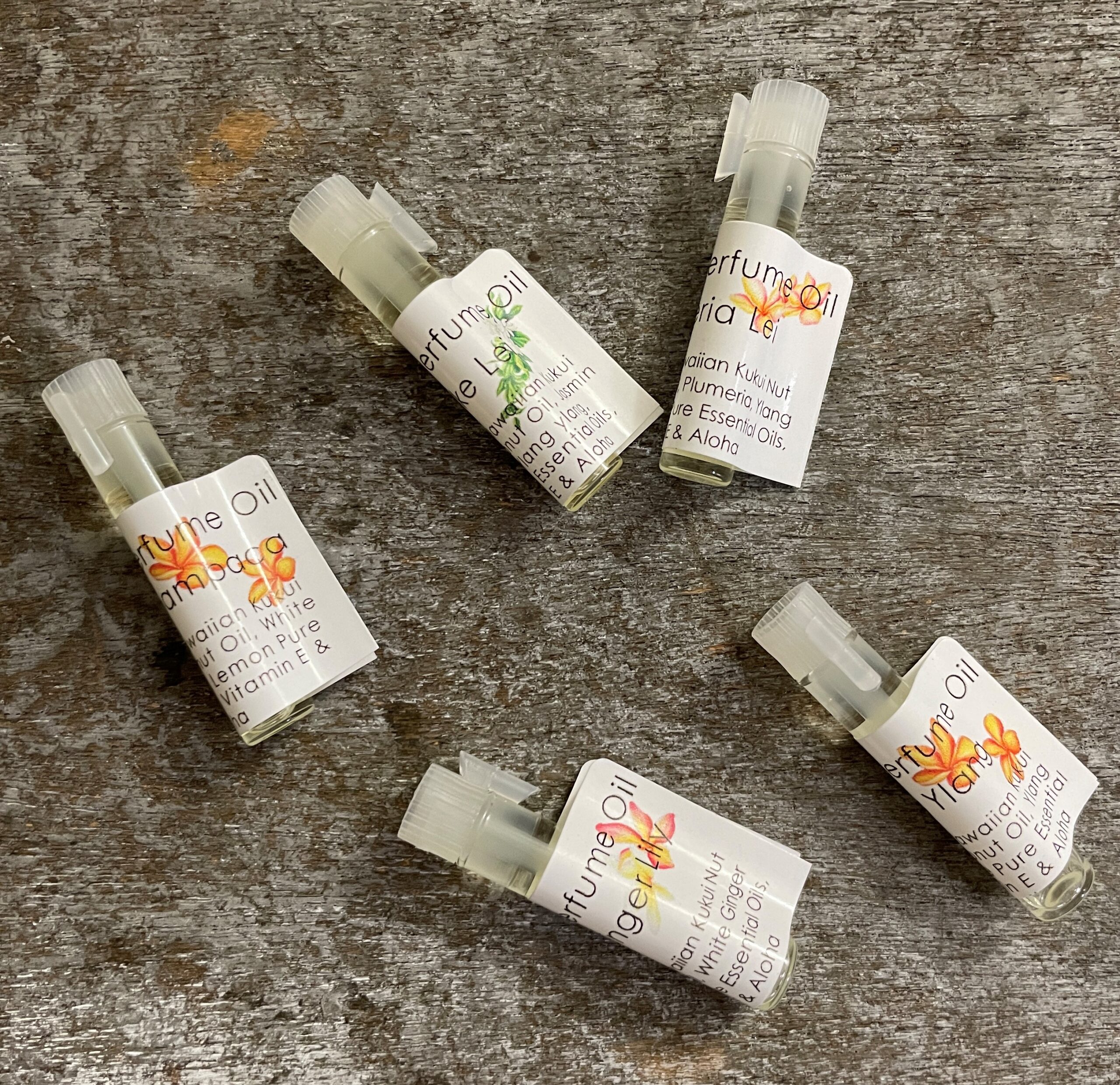 You can try 2 of our natural perfume oil (we currently have 3 gorgeous scents) before committing regular 5ml bottles. Natural and Pure essential oils of flowers are added in the base of Hawaiian Kukui Nut and natural coconut oils. Enjoy the natural and pure floral scents.