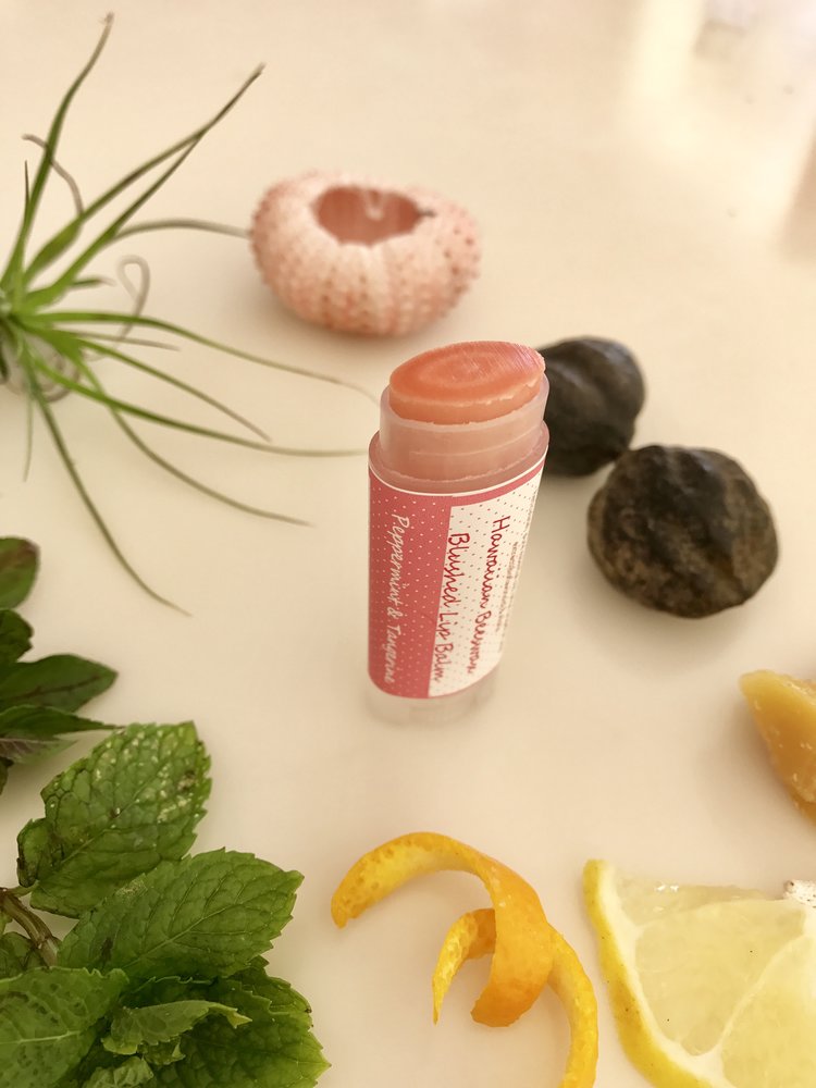 Hawaiian Beeswax, Olive, Castor, Kukui Nut, Jojoba, Coconut oils, Aloe, Cocoa Butter, Vitamin E, pure Tangerine & Peppermint essential oils (Therapy Grade), FDA approved natural mica color, Grapefruit Seed Extract, and Aloha