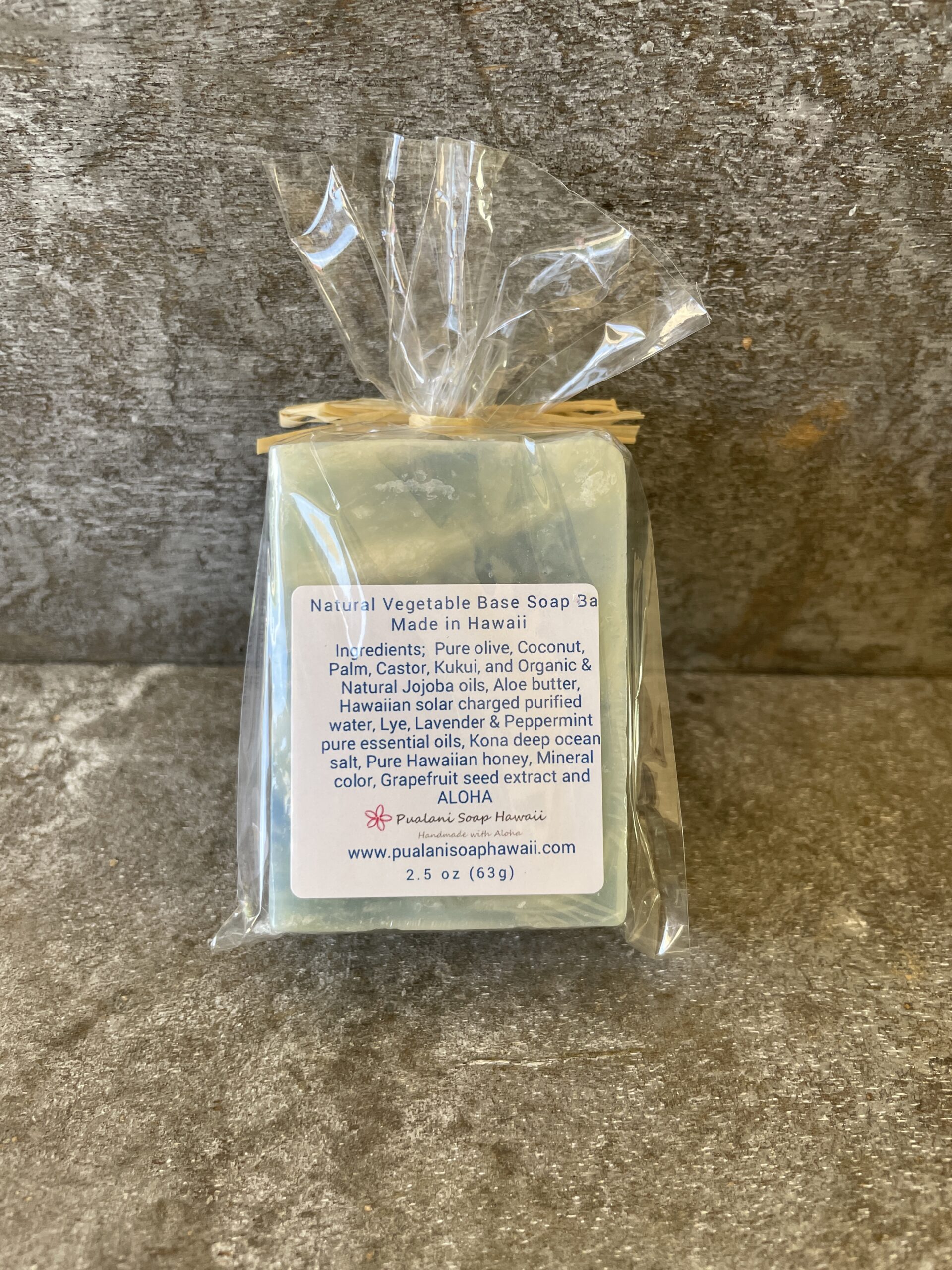 Ingredient List: Pure olive oil, Coconut oil, Palm oil, Castor oil, Aloe butter, Hawaiian Kukui Nut oil, Organic and natural jojoba oil, Hawaiian solar charged purified water, Lye, Lavender and peppermint pure essential oil, Kona deep ocean salt, Ultramarine mineral powder, Pure Hawaiian honey, Grapefruit seed extract, and Aloha