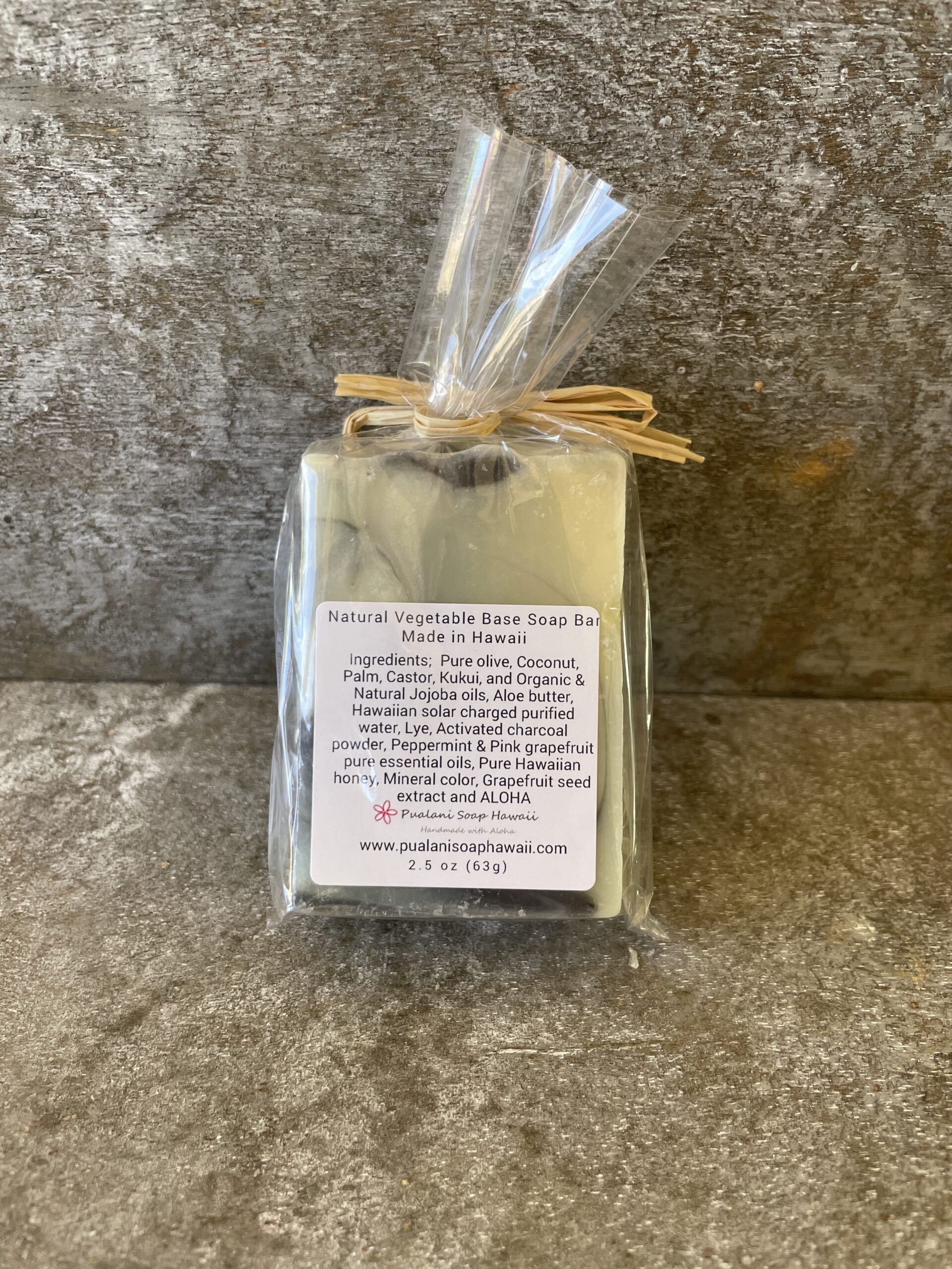 Ingredient List: Pure olive oil, Coconut oil, Palm oil, Caster oil, Hawaiian Kukui nut oil, Organic jojoba oil, Aloe butter, Hawaiian solar charged purified water, Lye, peppermint and pink grapefruit pure essential oils, Pure Hawaiian honey, Activated charcoal powder, Grapefruit seed extract, and Aloha