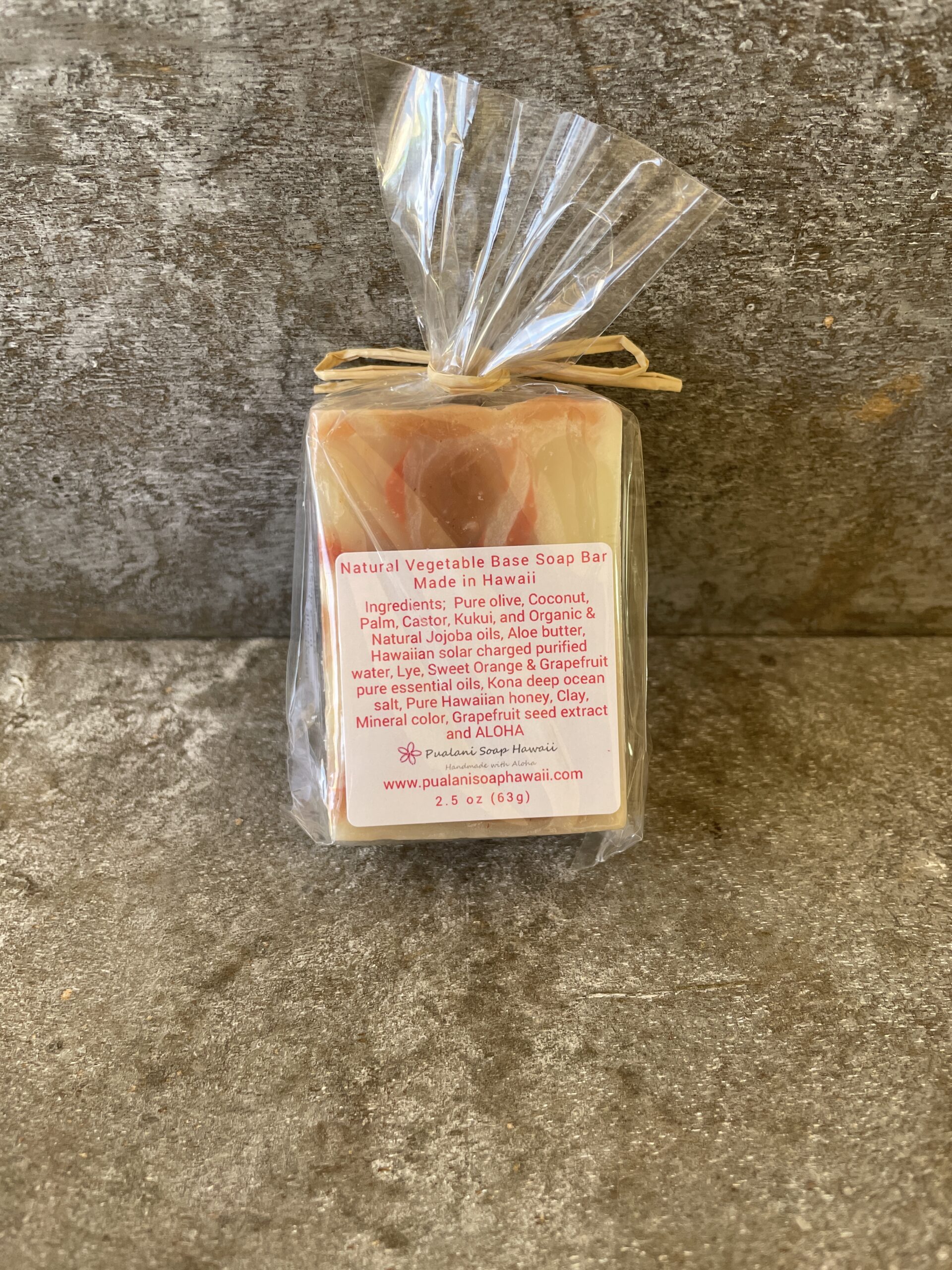 Ingredient List: Pure olive oil, Coconut oil, Palm oil, Castor oil, Hawaiian Kukui Nut oil, Organic and natural jojoba oil, Aloe butter, Hawaiian solar charged purified water, Lye, Kona deep ocean salt, Pure Sweet Orange and Pink Grapefruit essential oils, Hawaiian honey, Grapefruit seed extract, Moroccan clay, and Aloha
